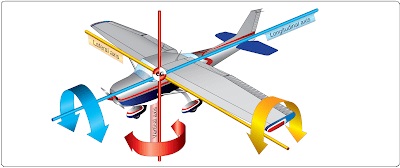 Aircraft can rotate in three axes. The pitch axis (yellow) is where the nose rises and falls. The roll axis blue) is where one wing goes up and the other goes down. The yaw axis (red) is where the tail moves to one side or the other.