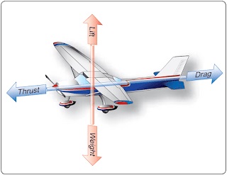 An aircraft feels four forces. Vertically, lift pushes the aircraft upwards and weight pulls it downwards. In the direction of travel, thrust from the engine or motor pushes it forward and drag holds it back. For level flight at a constant speed thrust must equal drag and lift must equal weight. To speed up we increase thrust and to climb we increase lift by speeding up. Just using up elevator to rise will probably cause a stall.
