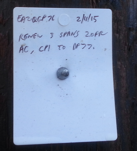Zilch. Nix. Nothing. Zero. Bugger all. Ho hum. Why am I not surprised? This notice appeared on a tree a couple of hundred metres away in the opposite direction to the wayside boxes. My translation is "Renew three spans [cable between posts?] using 20 pair aerial cable from post coded CP1 to post DP77." Thanks to Derrick for explaining AC. It's a recent date so maybe something is happening. I really must stop being optimistic. Must look for labels on the posts.