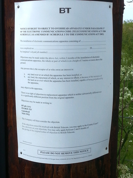 A white van with Superfast Fibre Broadband in large letters on its side was parked by a post a couple of hundred metres away. BBFN tells me that more of this area will be up and running in September. This is what the post now looks like. I am sure there wasn't all that gubbins there before. And there is an undated notice.