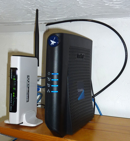 The system was installed very efficiently by Chris. I saved a bit of money by fitting the brackets, mast and cable ducts. I fitted a 50mm steel mast and a T/K pair of wall brackets which gives good stability as the clamps can be made very tight. As well as the tooway Via-Sat modem, on the right in the picture, you get a wireless router which also provides the DHCP addresses for your network. I have a fairly extensive network with up to twelve devices attached, using a mixture of wireless and wired connections including gigabit ethernet.